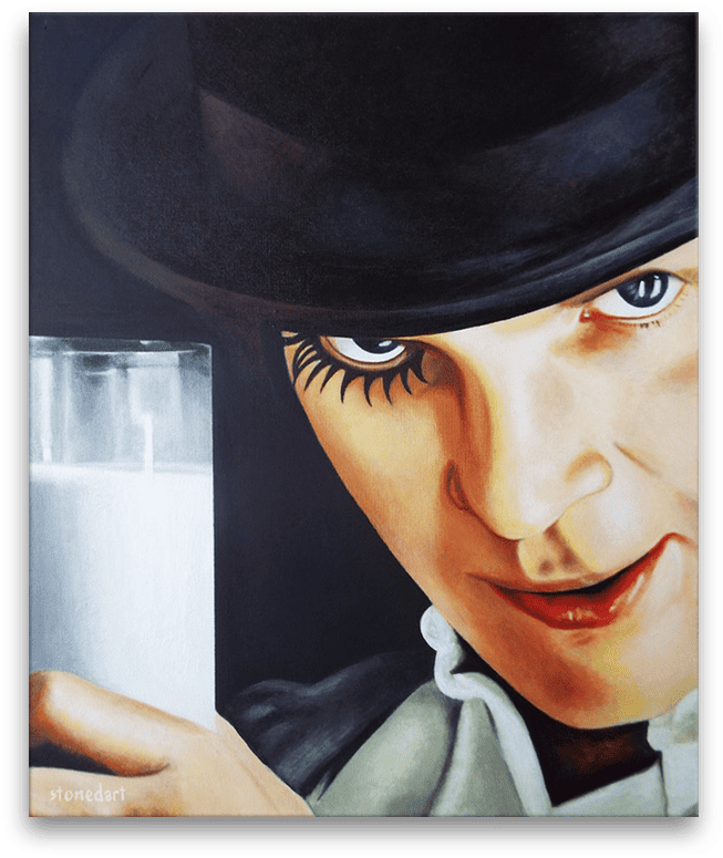 Original painting artwork. Malcolm McDowell playing the part of Alex the Droog in Stanley Kubrick’s 1971 production of ‘A Clockwork Orange’, based on the novel by Anthony Burgess.