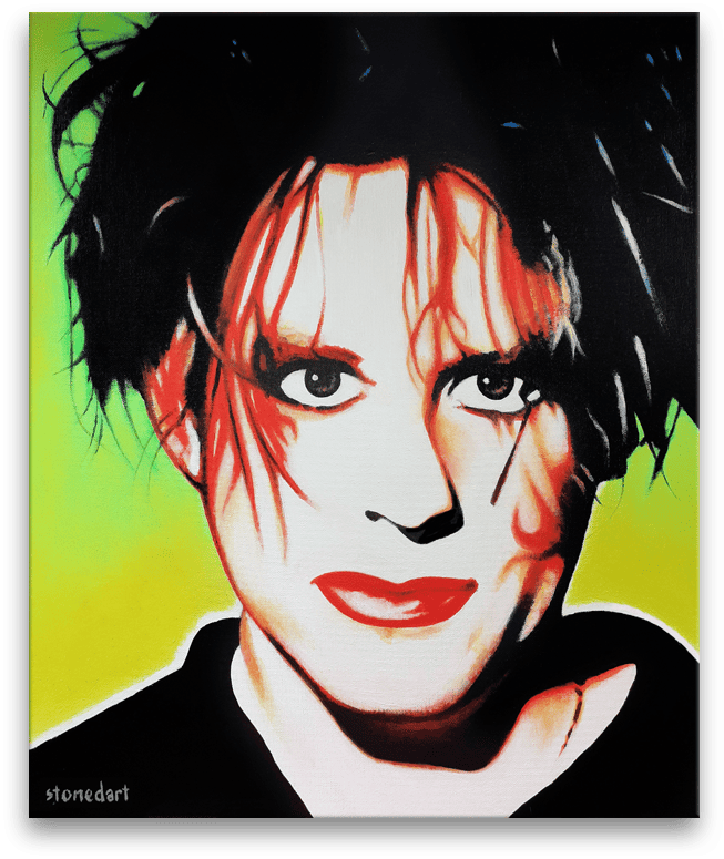 Original painting artwork. Robert Smith, lead singer, guitarist, multi-instrumentalist, primary songwriter, and only continuous member of The Cure, which he co-founded in 1976. Also one time lead guitarist with The Glove and Siouxsie and the Banshees. Gothic icon and inspiration for Johnny Depp’s portrayal of Edward Scissorhands in the Tim Burton movie of the same name.